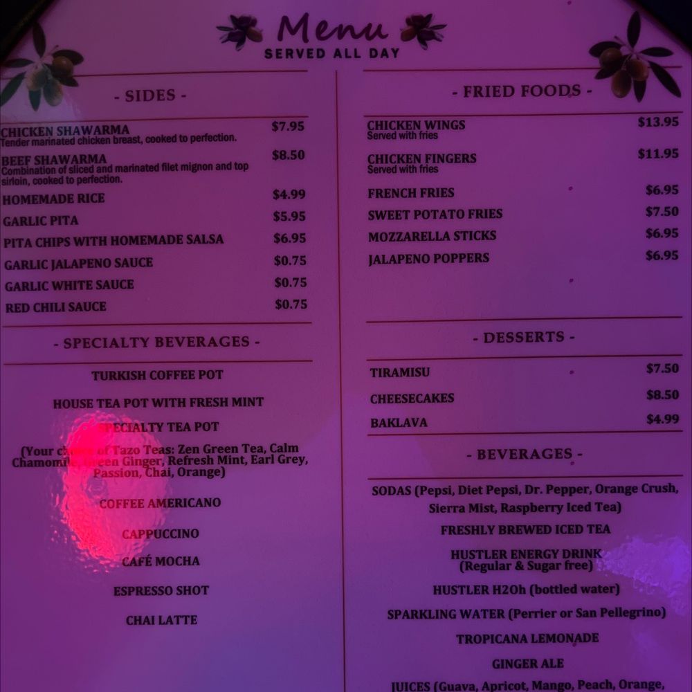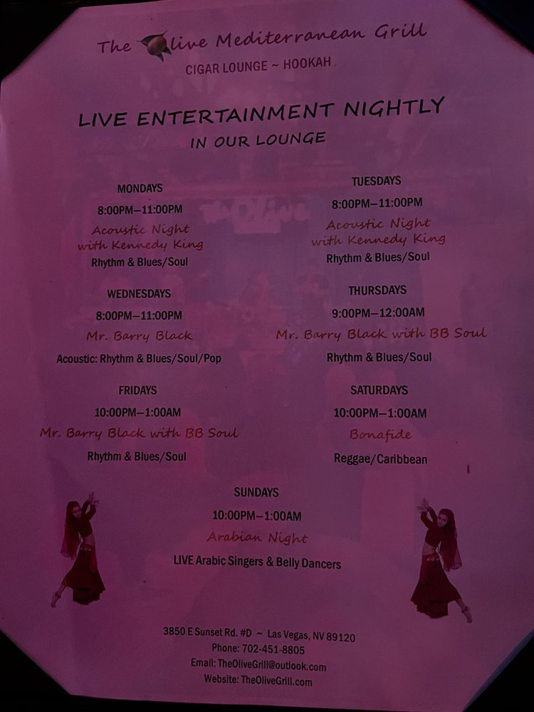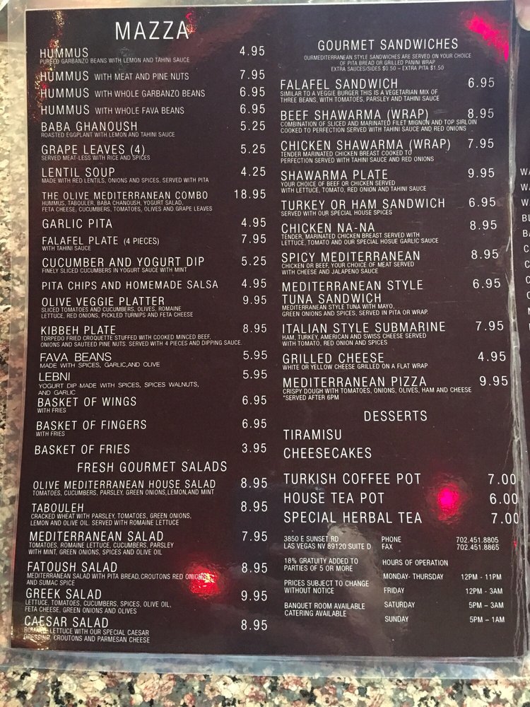 Introducing The Olive Mediterranean Grill, a hub of Mediterranean flavors in Las Vegas. From hummus to shawarma, this restaurant offers a wide range of dishes that will tantalize your taste buds. The menu features classics like Olive Mediterranean House Salad and Falafel Sandwich, along with innovative options like Beef Shawarma Wrap. Customers rave about the relaxed atmosphere, attentive service, and live music. Whether you're a fan of hookah or simply looking for a place to enjoy delicious food, The Olive has something for everyone. Don't miss out on their signature dishes like Dolma and Wings, which have left customers impressed and craving more. With a diverse drink menu and a variety of vegetarian options, this restaurant is a must-try for anyone seeking a memorable dining experience.